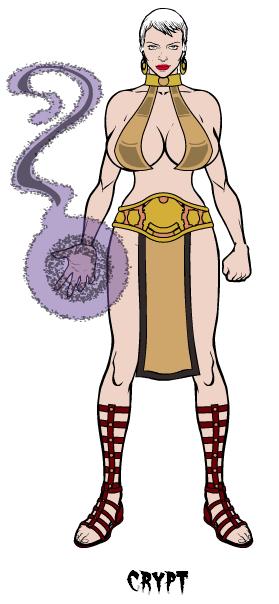 PODERES SOBREHUMANOS CONOCIDOS…: Crypt posee fuerza sobrehumana para alzar 1.000 toneladas sin esfuerzo; poderes mágicos prácticamente ilimitados, capacidad para canalizar energía mística pura, que proyecta a través de sus ojos en forma de rayos de poder devastador y capacidad para teleportarse entre dimensiones. Al tratarse de un muerta viviente es prácticamente inmortal o, al menos, muy difícil de vencer por medios convencionales.